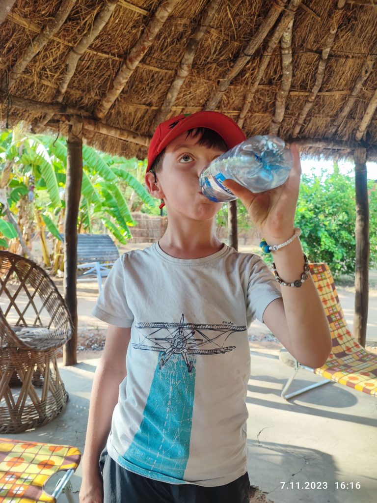 Wojtka wsadzam tu pod prysznic za każdym razem kiedy widzę, że już mi się buzia zmienia na zmęczoną. Ponieważ on pomimo tych upałów cały czas goni tutaj za piłką i bawi się z miejscowymi dziećmi, to jego wydatek energetyczny i potrzeba uzupełniania płynów jest olbrzymia. Dlatego zimna woda z prysznica dla ochłodzenia ciała oraz wypicie chwilę całej butelki wody 0,7l na raz to absolutna konieczność. Zresztą ta woda paruje z niego w czasie rzeczywistym, bo pomimo tego że pije tu na prawdę dużo, to prawie w ogóle nie chodzi do ubikacji. To tylko pokazuje jakie tutaj organizm ma zapotrzebowanie na wodę.