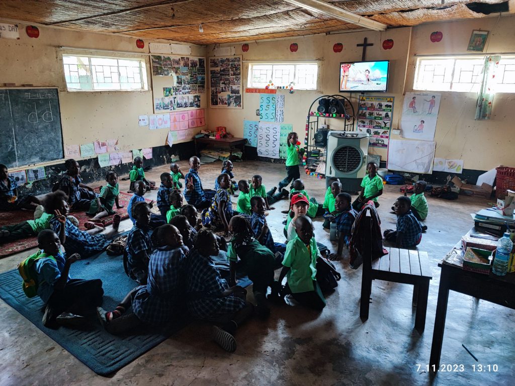 Wojtek miał chwilę wolnego, więc poszedł do dzieciaków do klasy. Siedział razem z całą ekipą na dywanie na podłodze i uczestniczył w lekcji. Dzieci oglądały akurat Epokę Lodowcową po angielsku, więc Wojti razem z nimi. W klasie były tam dzieciaczki z przedszkola i 1 klasy, więc tylko trochę młodsze.