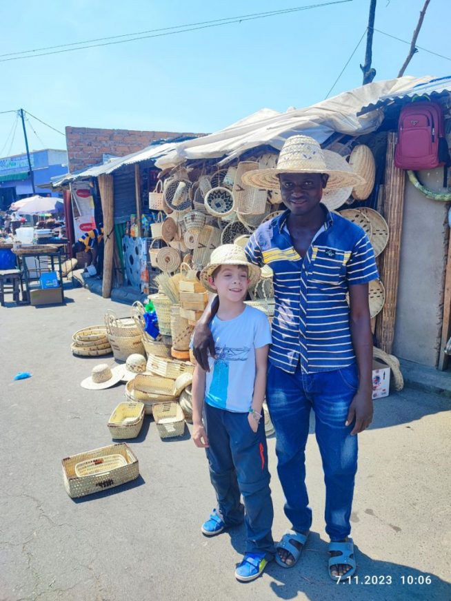 Ruszamy w drogę. więc możemy być już poza zasięgiem ale do Mpanshya. Jeszcze w trasie. zatrzymaliśmy się na chwilę na targu w Luangwa, żeby Gosia mogła kupic jakieś prezenty do Polski. Wojtek poszedł z nami i dostał w prezencie od pana, który handlował wyrobami z trawy, prawdziwy zambijski kapelusz.